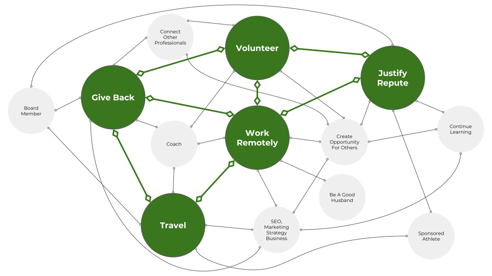 Earlier this year I wrote an article on Scott Fish, a marketing strategy and SEO expert (read more…). It was a fascinating informational interview that led to an even more fascinating written result. Scott took stock of his values, beliefs and resources and created new opportunities and resources that, interconnected, created an exemplary lifestyle business. The activity-system map below depicts those factors that in aggregate become the over-arching strategy (green = strategies; gray = activities)