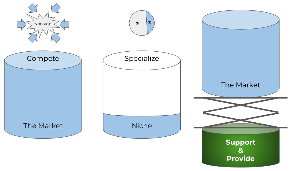 - Compete in a way that supports and provides services to the entire market in a way that makes use of existing opportunities and resources – Strategic. Ex. Offering organization development services based upon financial data already in the possession of the accounting firm as a coupling strategy. (Read more…)