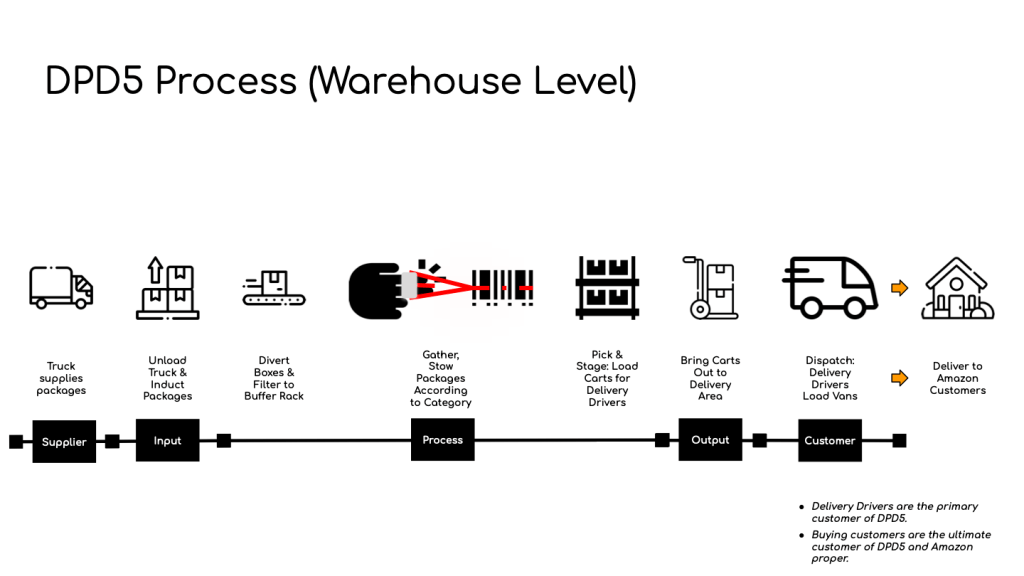 Perhaps the biggest revelation of this process map is acknowledging that delivery drivers are the primary customer of the warehouse, while Amazon.com customers are the ultimate customer.