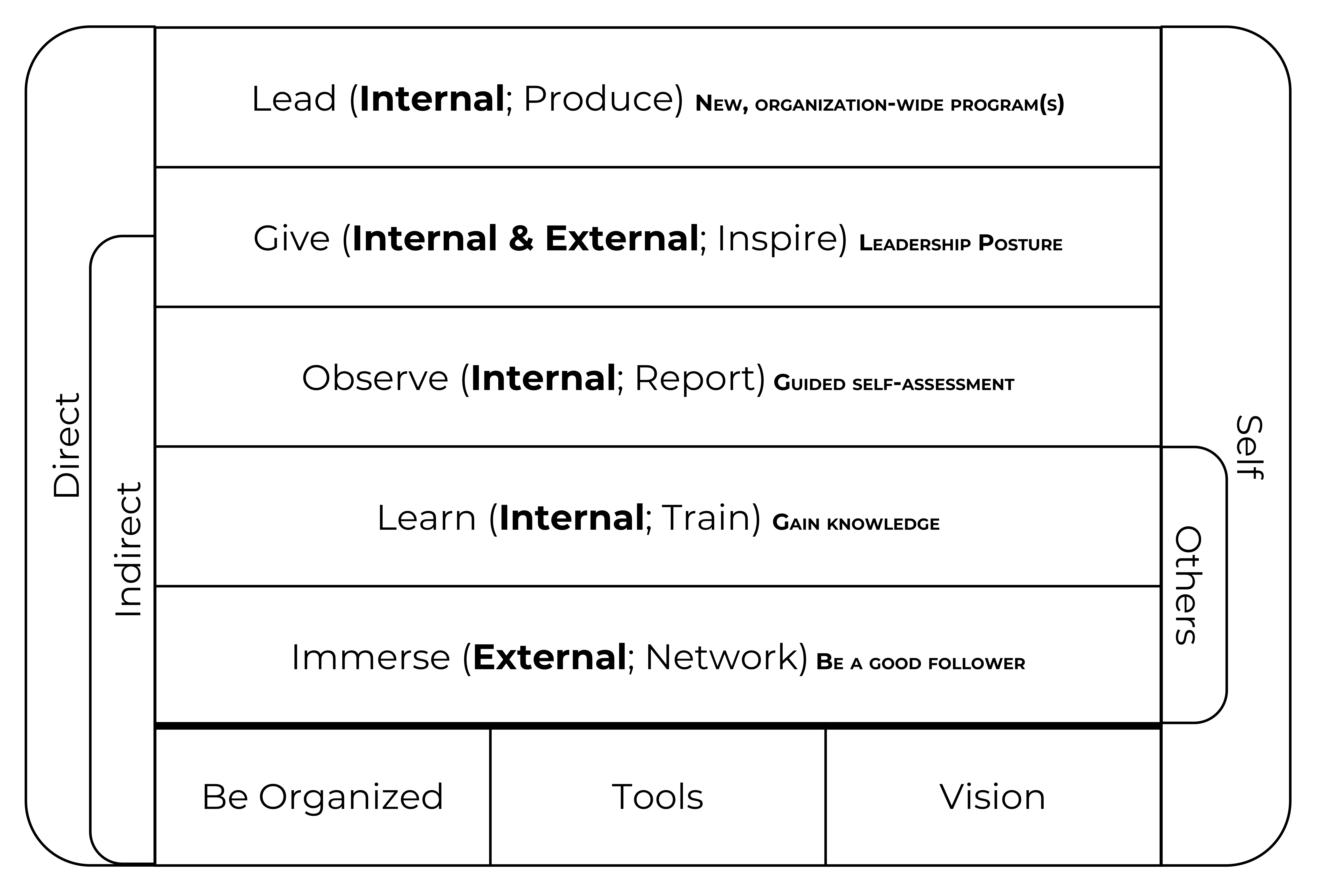 Leadership has both direct and indirect activities that are self-guided and led by others, respectively. These activities may be developed by the practitioner both internally in the organization and externally, say, in the community. All the while, 3 pragmatic fundamentals should be incorporated into everything the leader does.