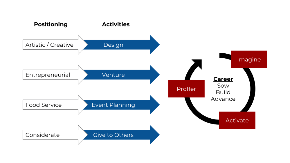 I observed from Jill’s anecdotal history that her personal attributes and foci (the white arrows in the above graphic) turned into motivations and aspirations (the blue arrows). And those aspirations continue to materialize into a unique career.